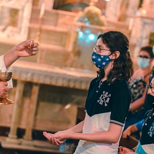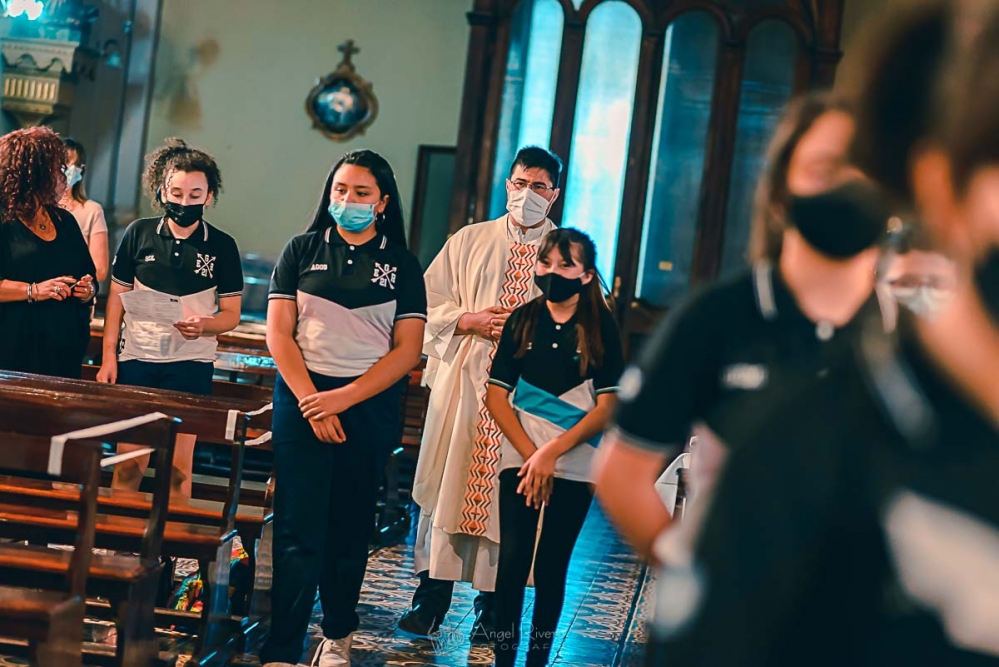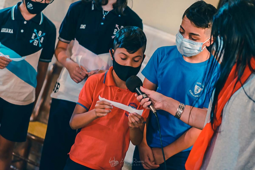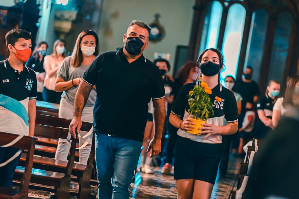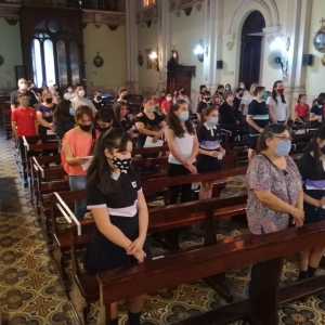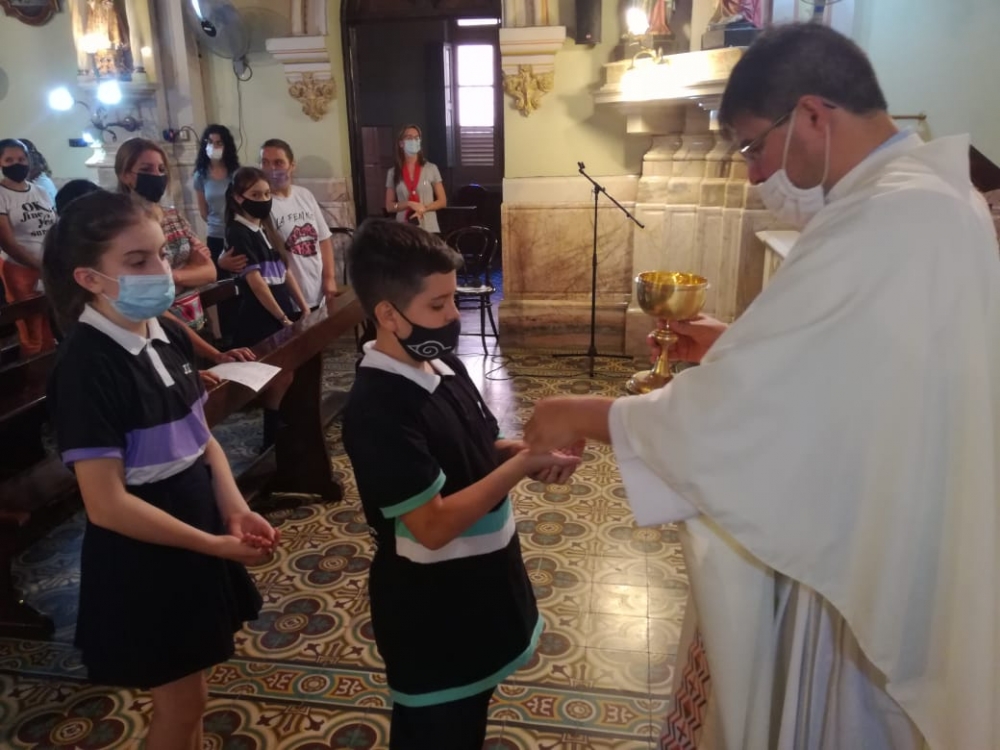 Los estudiantes de Sexto Grado, Promoción 2021, compartieron la última Misa de Nivel Primario, presidida por el padre Fernando. En la misma, y acompañados por los directivos, docentes y sus familias, recibieron como obsequio un prendedor con la imagen de Nuestra Madre Santísima del Huerto y una preciosa tarjeta con este mensaje: