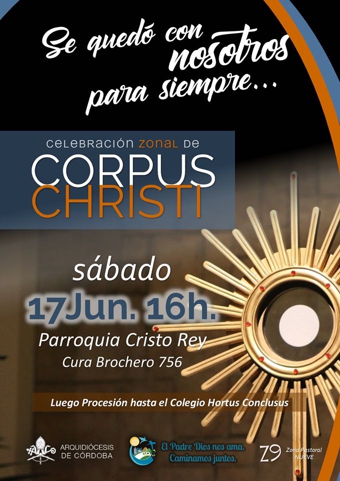 Invitamos a la comunidad a participar del Corpus Christi de la zona pastoral 9 el día Sábado 17 de Junio a las 16:00 Hs desde la Parroquia Cristo Rey vamos en procesión a nuestro colegio Hortus Conclusus